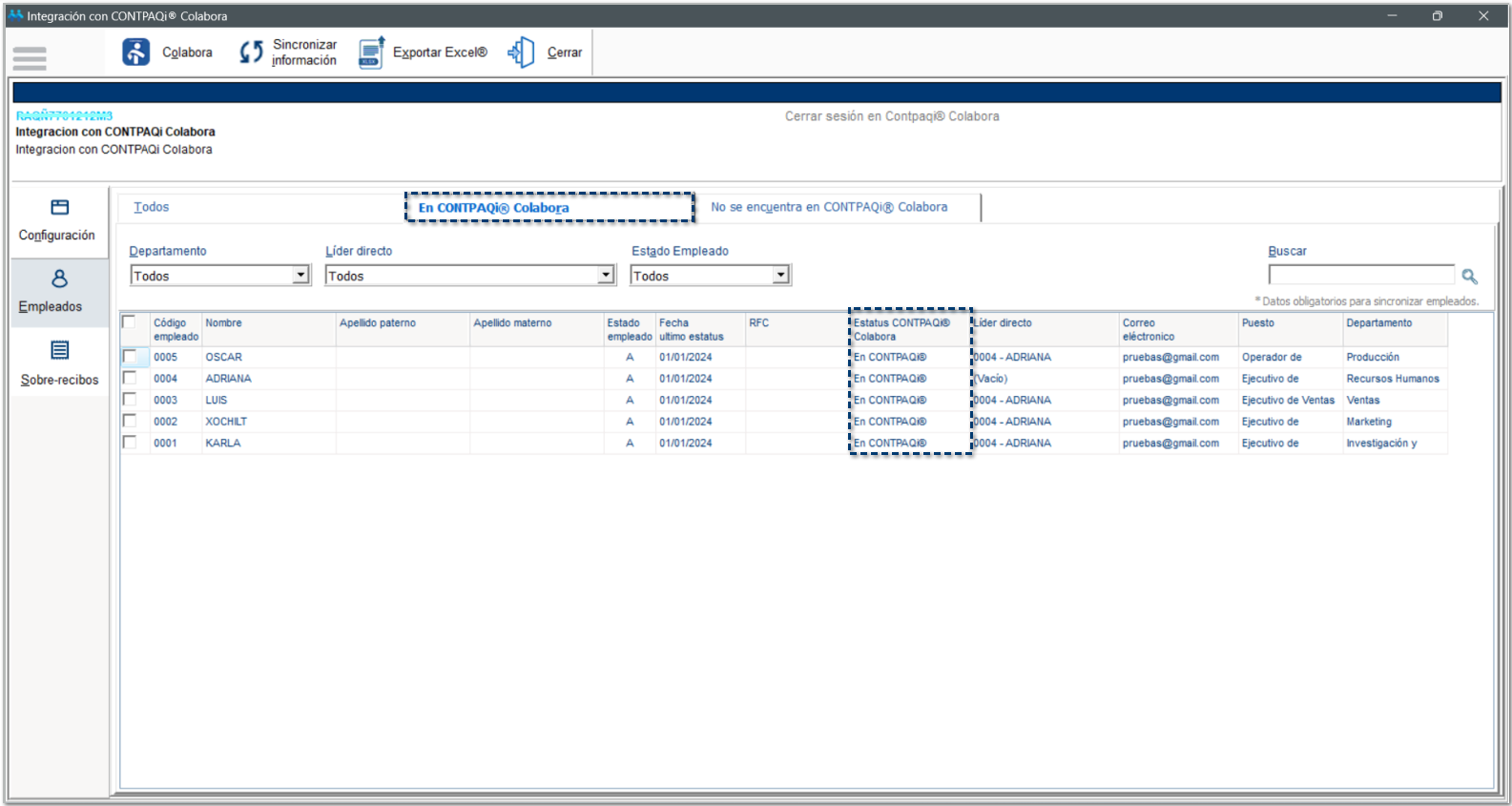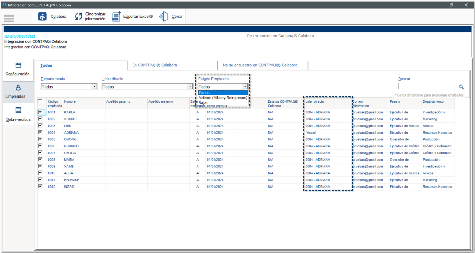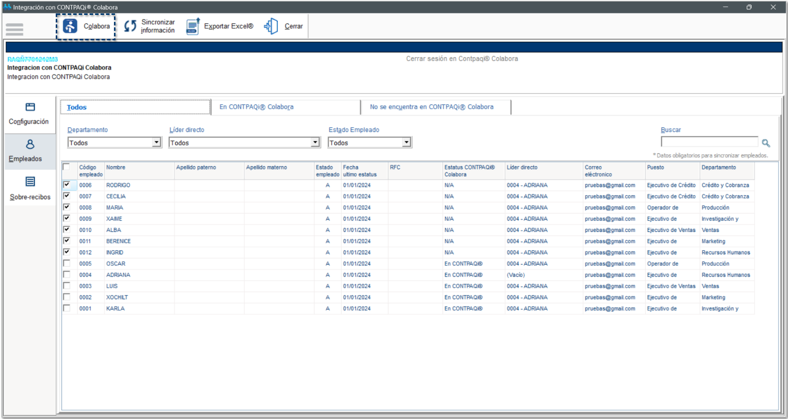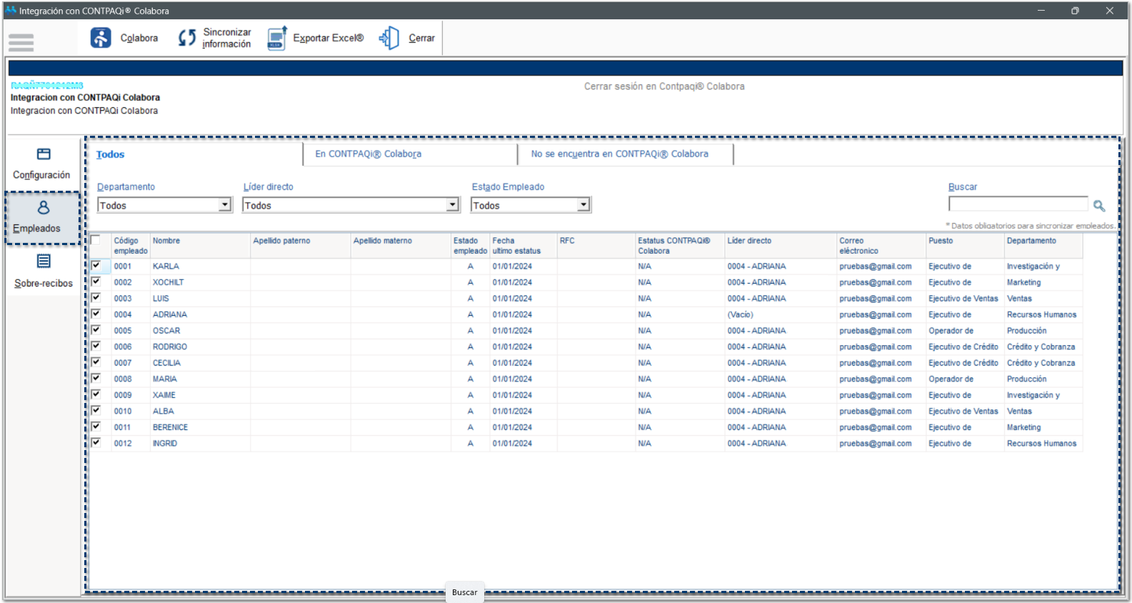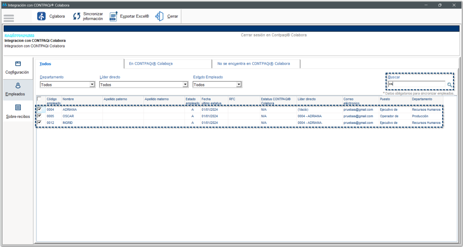 En esta pestaña visualizarás Todos los empleados, es decir, los empleados que ya se encuentran registrados en CONTPAQi® Colabora, así como los empleados que aún no se han sincronizado hacia la empresa de Colabora.
