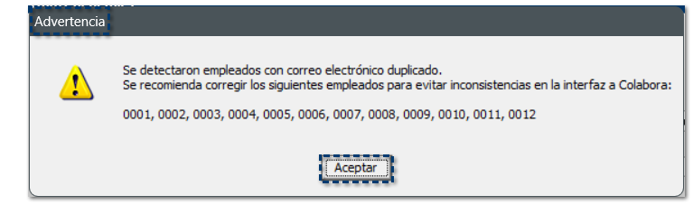 En caso de tener información duplicada dentro del catálogo de Empleados, al momento de sincronizar la información, se mostrará un mensaje de advertencia para corregir a los empleados y evitar inconsistencias.