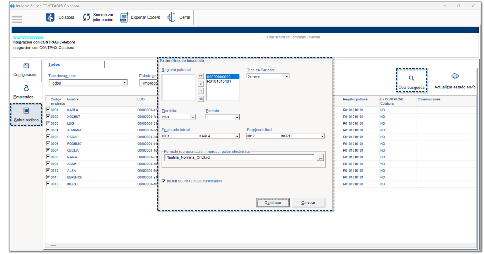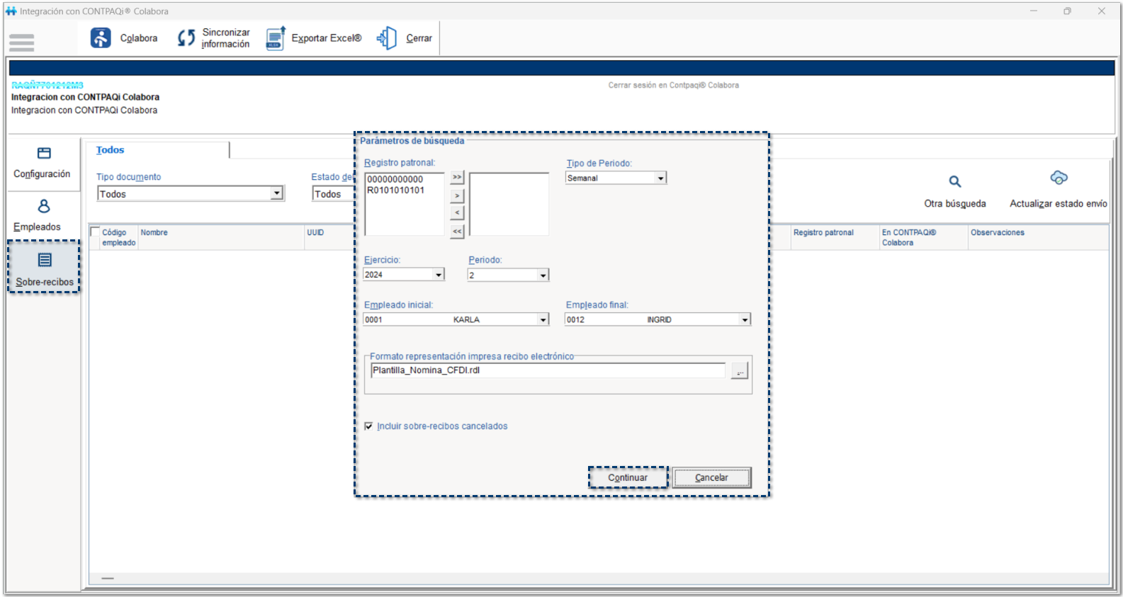Al seleccionar la opción Sobre-recibos, se mostrará la ventana de Parámetros de búsqueda, que te permitirá seleccionar un rango de periodos y empleados, para realizar la búsqueda de los sobre-recibos que se enviarán a la empresa de CONTPAQi® Colabora.