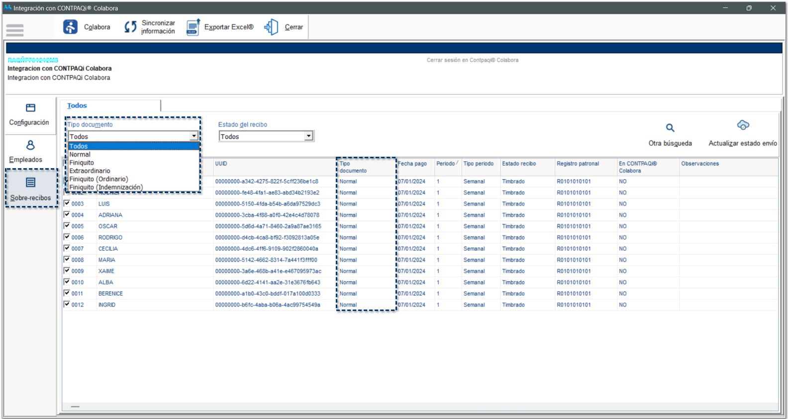 Con la opción Actualizar estado envío, podrás actualizar el estatus de los sobre-recibos enviados a la empresa de CONTPAQi® Colabora.