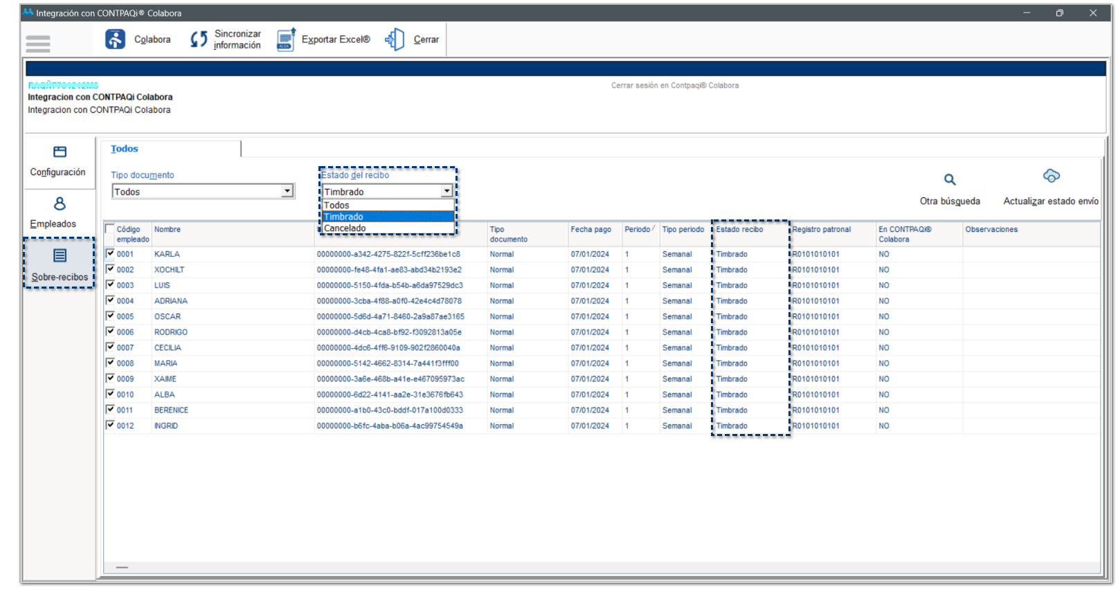 Se desplegará el listado de los Estados del los sobre-recibos: Timbrado, Cancelado.
