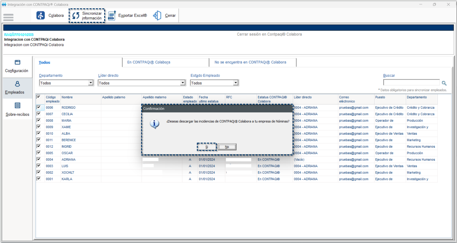 Al realizar el proceso de Sincronizar información, se mostrará una ventana de confirmación para descargar las incidencias de la empresa de Colabora a la empresa de Nómina.
