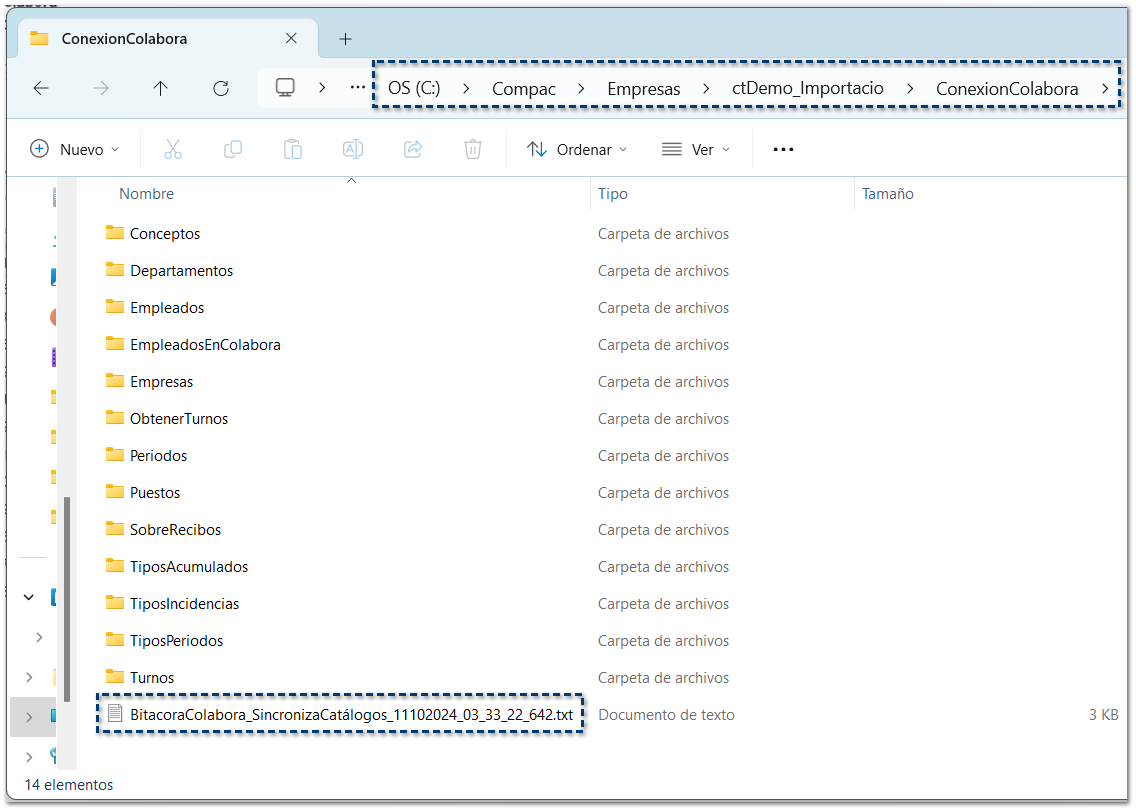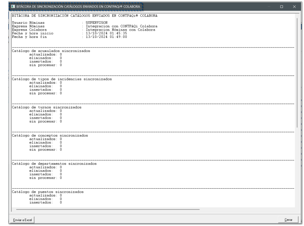 Se genera una bitácora del proceso de sincronización, con el informe de los catálogos que fueron enviados a la empresa de Colabora.