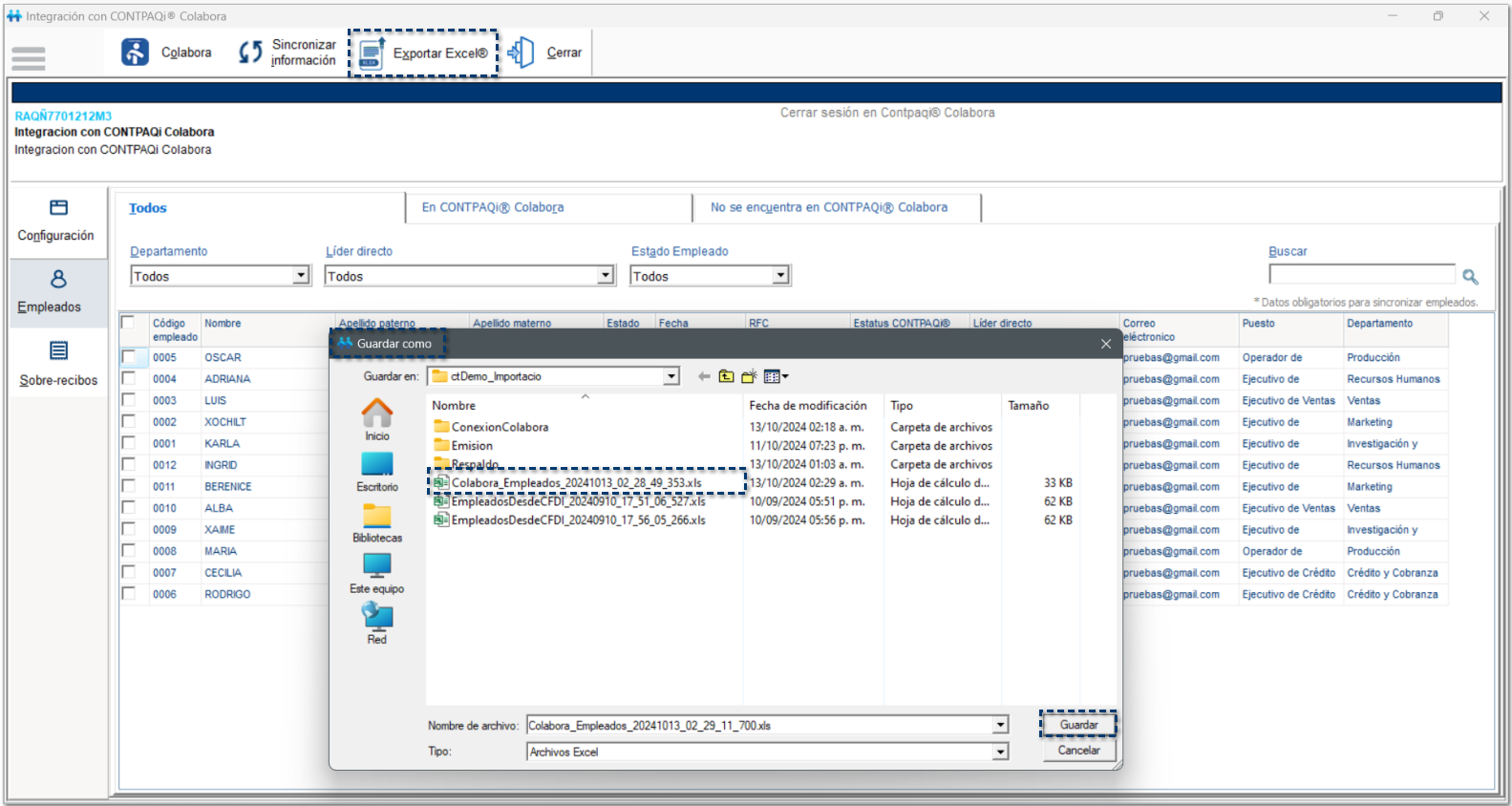 Al hacer clic en la opción Exportar Excel®, se mostrará el Explorador de Windows®, para guardar el archivo generado.