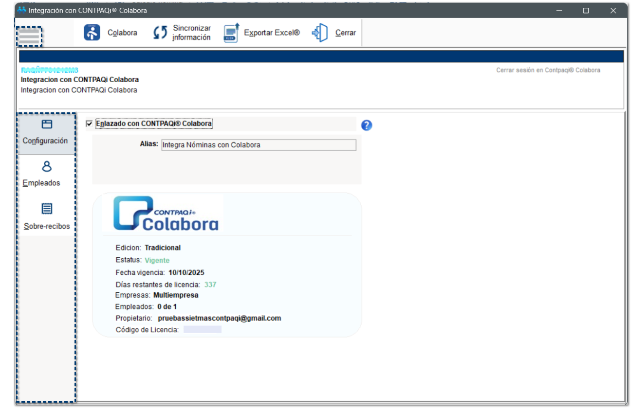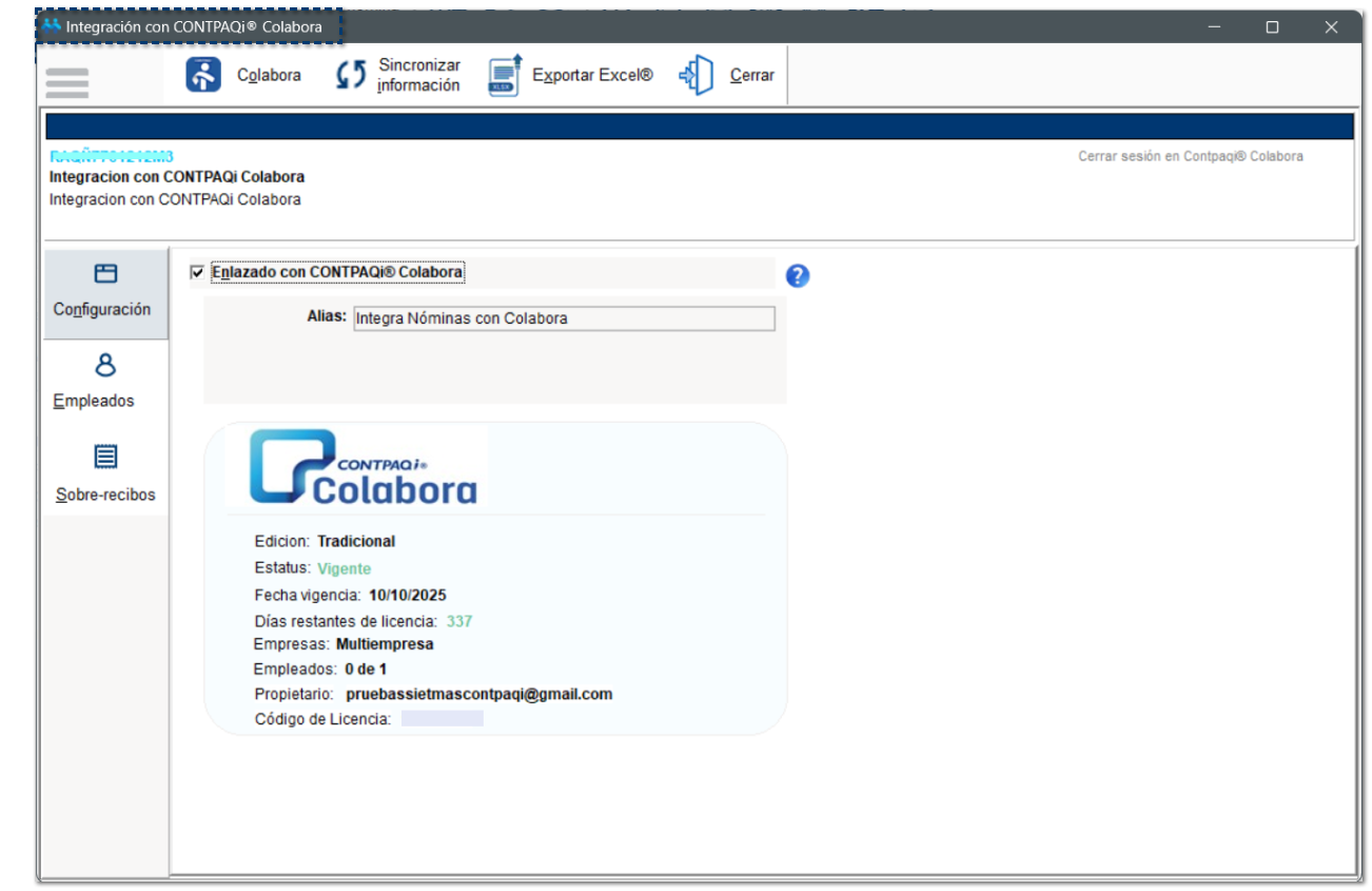 ¤ Licencia de CONTPAQi® Colabora: Se mostrará el detalle de la licencia adquirida en Colabora, así como el correo registrado como propietario de la información.