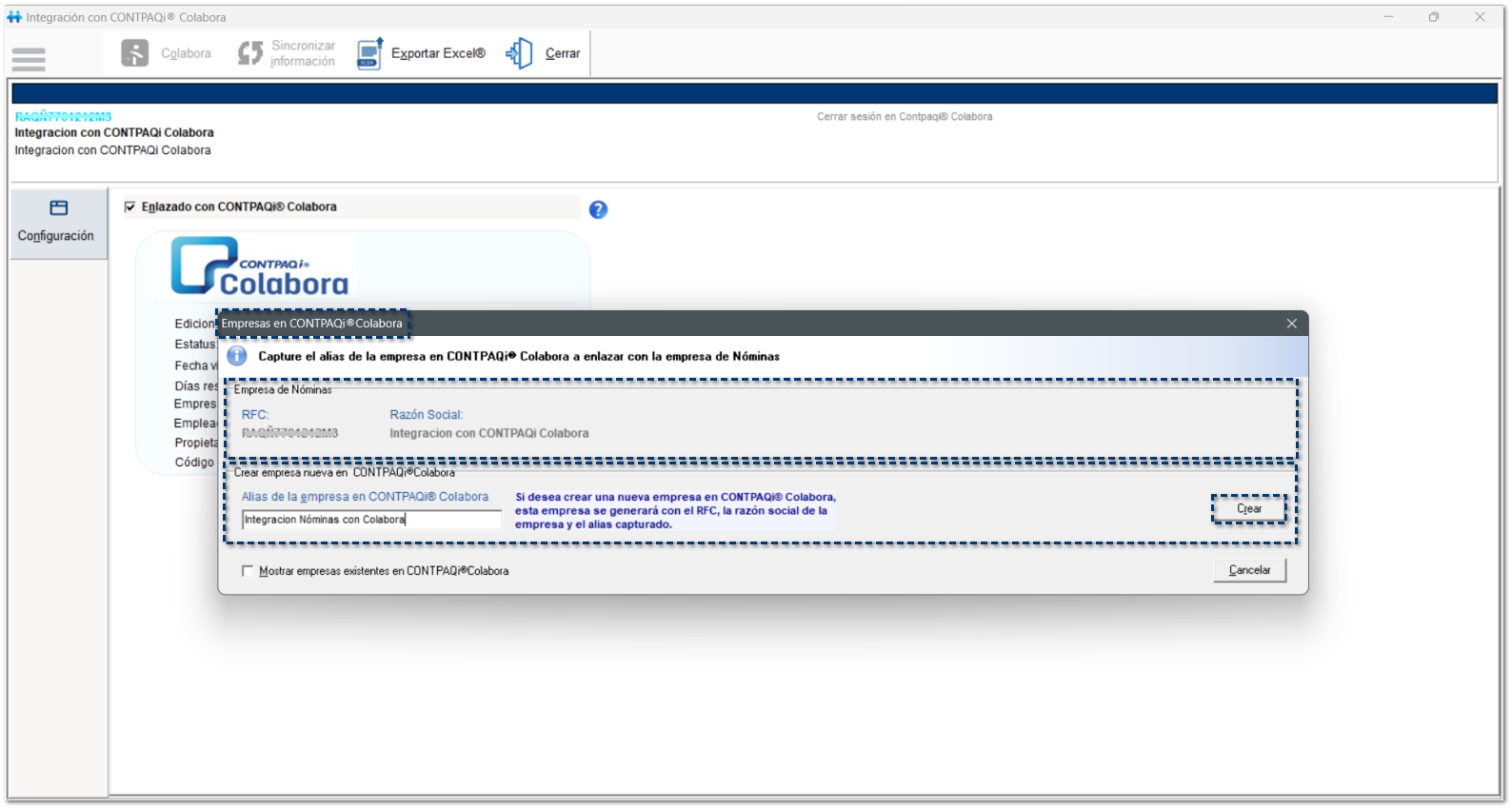 Si deseas crear una empresa nueva en CONTPAQi® Colabora, esta empresa se generará con el RFC, la razón social de la empresa y el alias capturado.