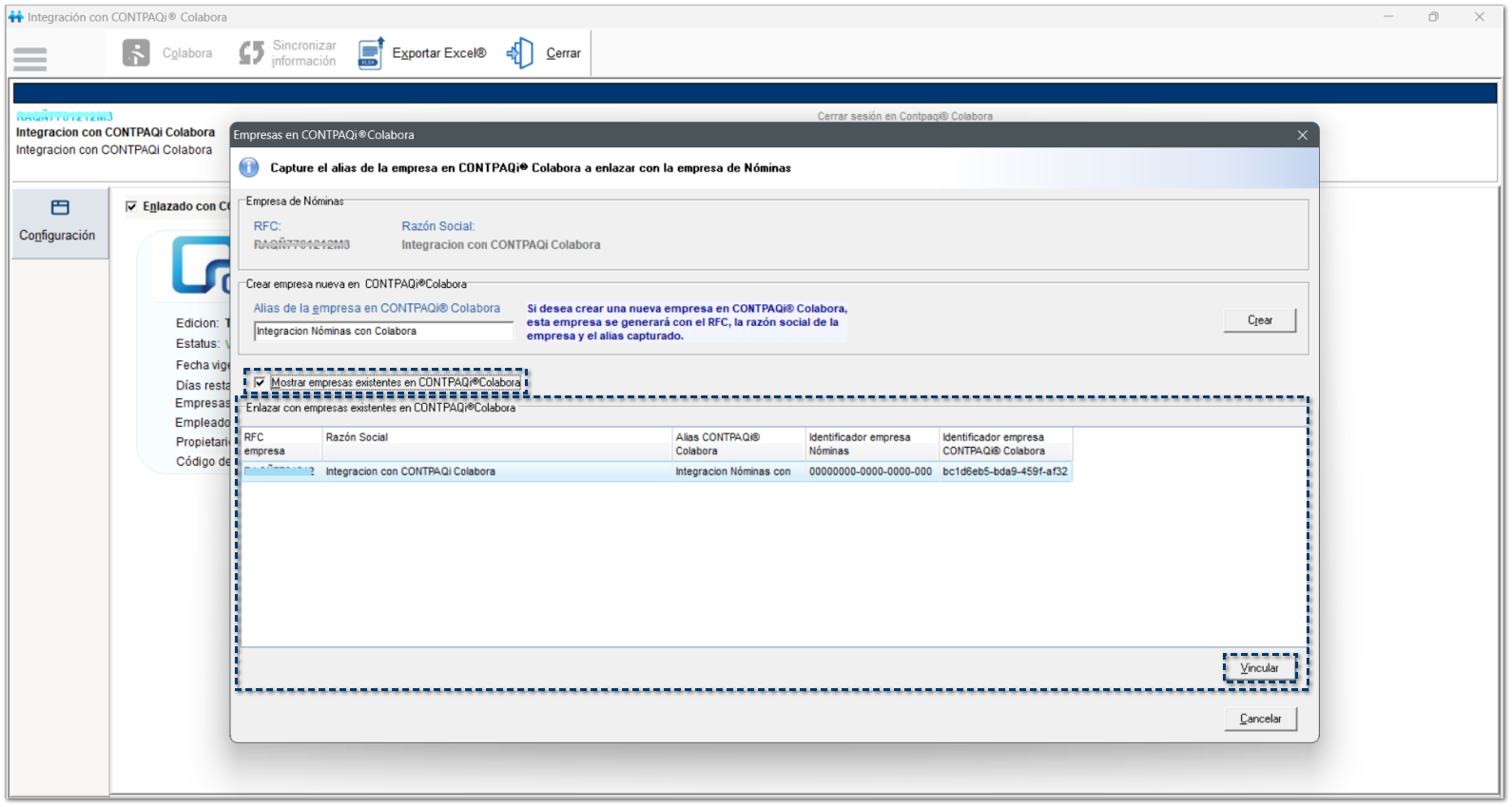 Al habilitar el check Mostrar empresas existentes en CONTPAQi® Colabora, podrás consultar si tienes empresas que ya estén creadas en CONTPAQi® Colabora, así mismo, podrás elegir si deseas vincular tu empresa de Nóminas con una ya existente.
