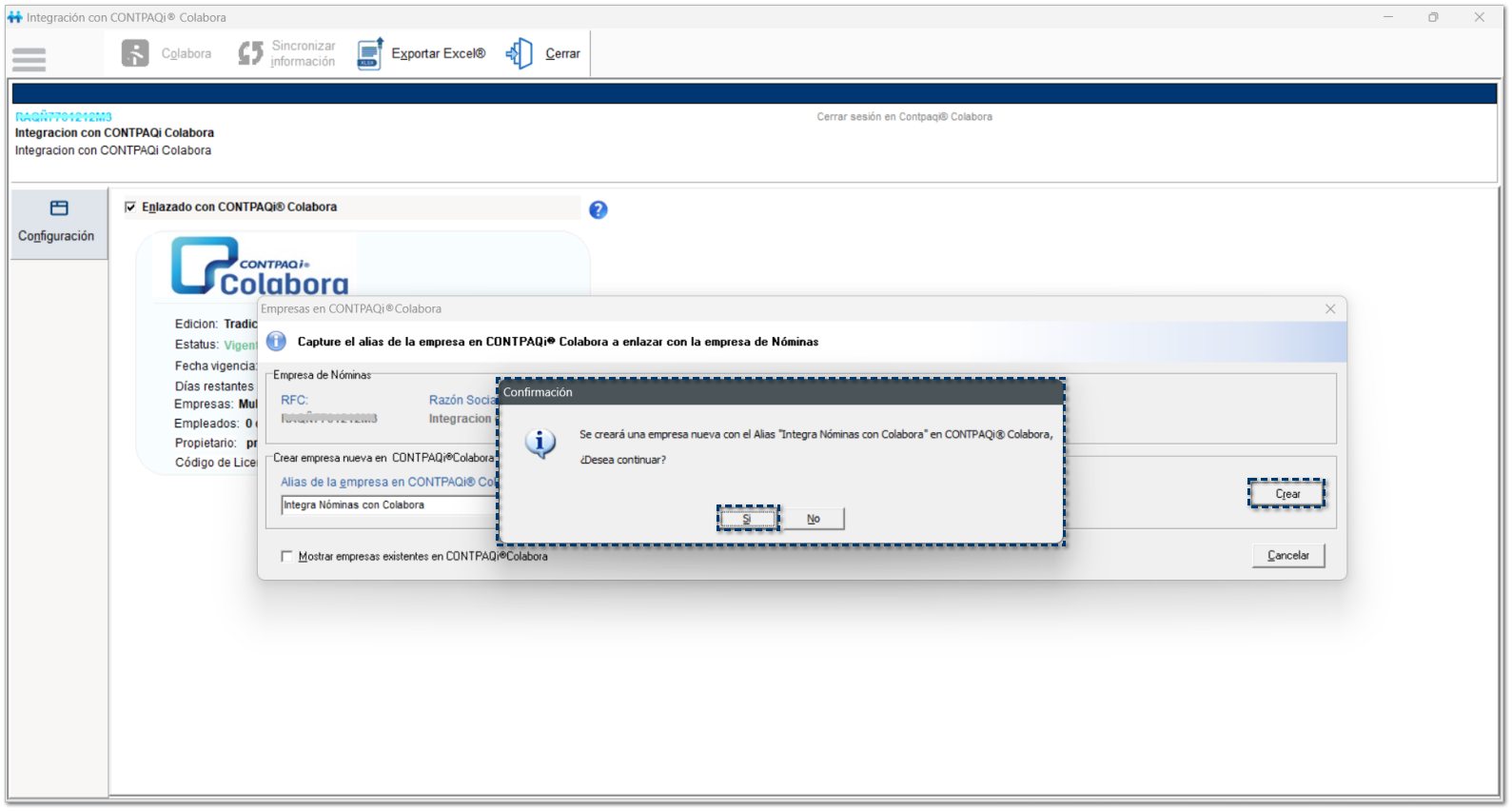 Después de hacer clic en el botón Crear, se mostrará la siguiente ventana de confirmación que te indica que se creará la empresa en CONTPAQi® Colabora, con el alias que previamente capturaste.