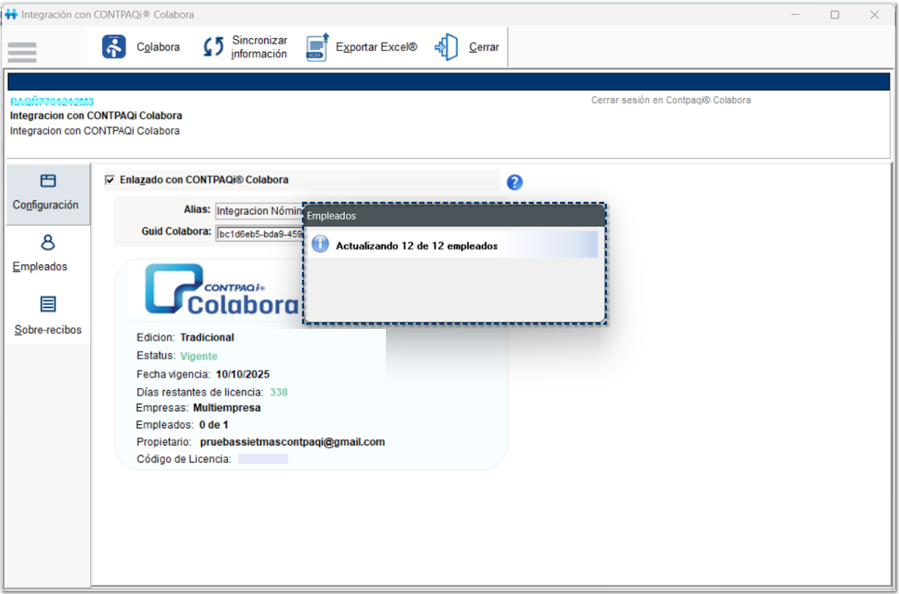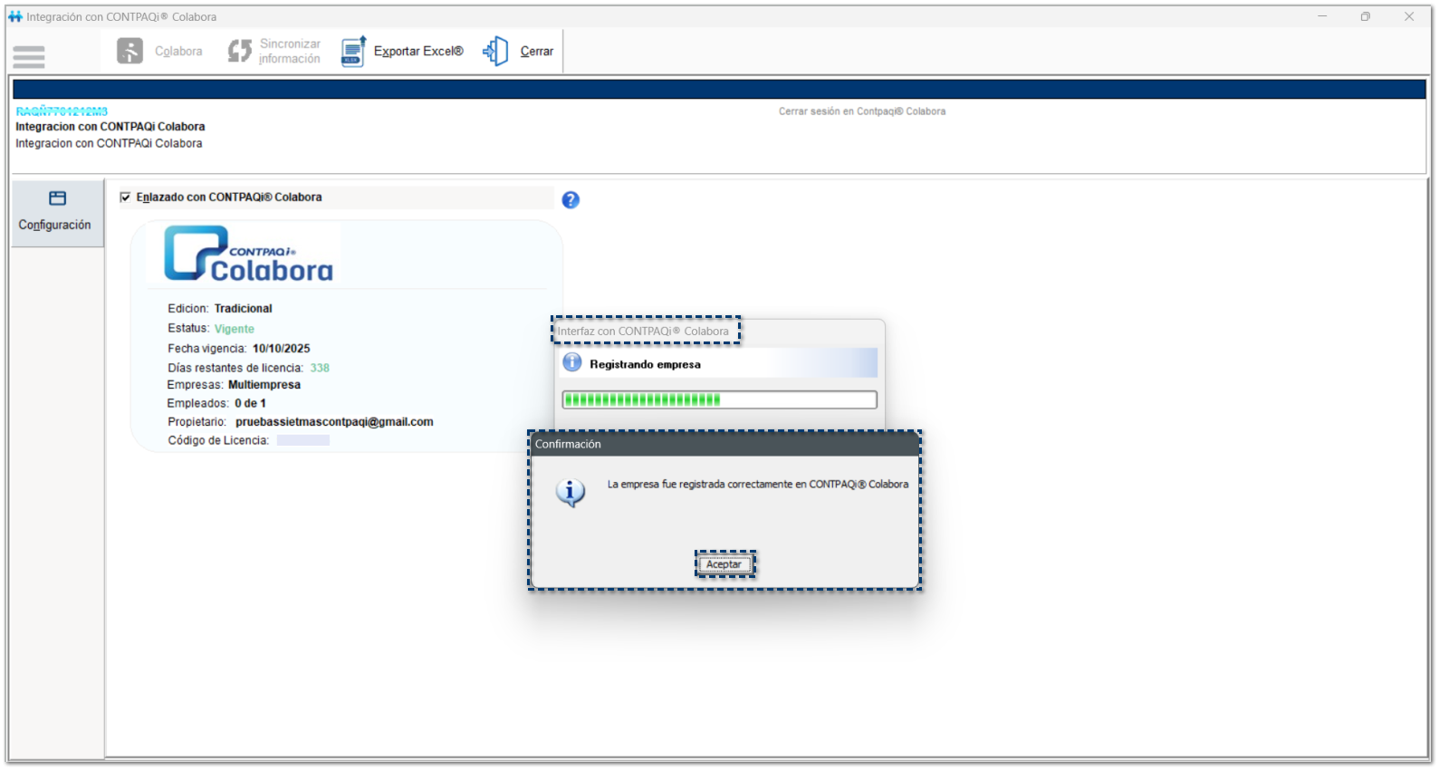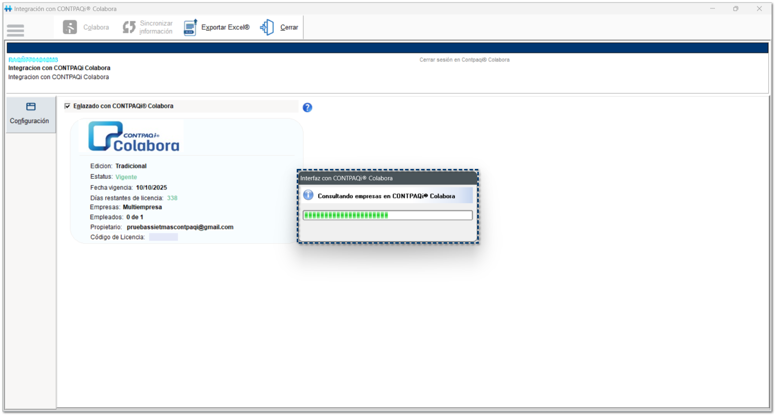 Después de hacer clic en Si, para continuar, se mostrará el avance del proceso de Interfaz con CONTPAQi® Colabora.