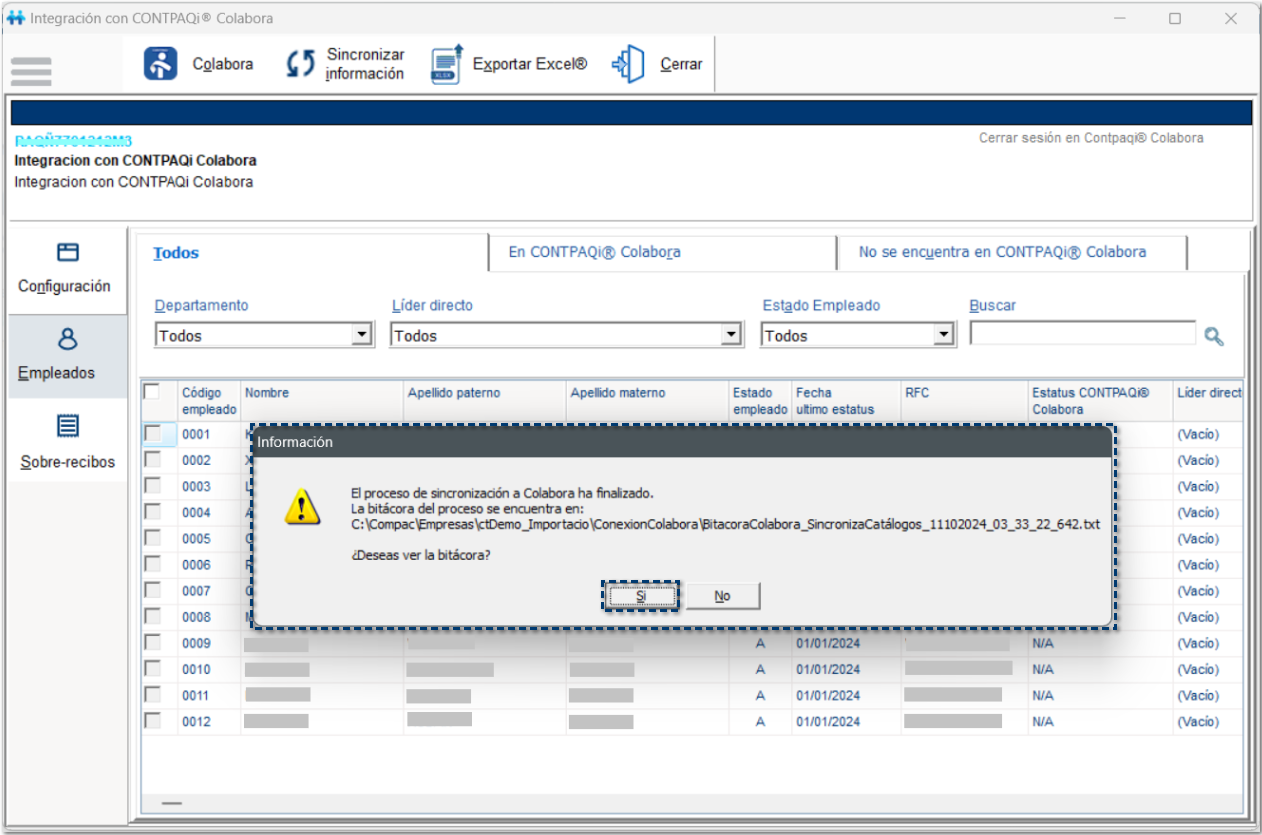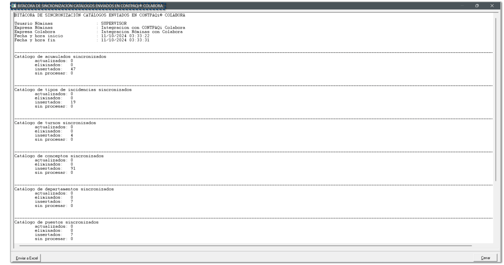 Al finalizar el proceso de sincronización de catálogos a CONTPAQi® Colabora, se mostrará la bitácora del proceso para que puedas validar el resultado del proceso.
