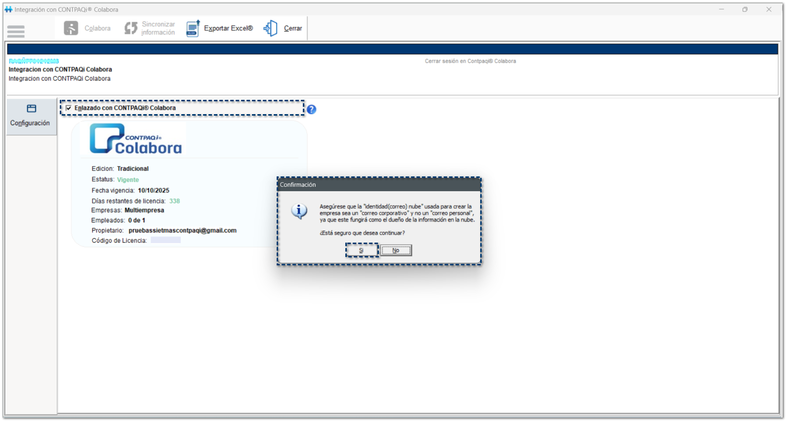 "Asegúrese que la "identidad(correo) nube" usada para crear la empresa sea un "correo corporativo" y no un "correo personal", ya que este fungirá como el dueño de la información en la nube. ¿Está seguro que desea continuar?"