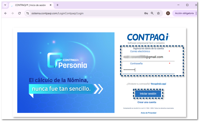 Ingresa al link: https://sistema.contpaqi.com/LoginContpaqi/Login y captura los datos de acceso y haz clic en Iniciar sesión.