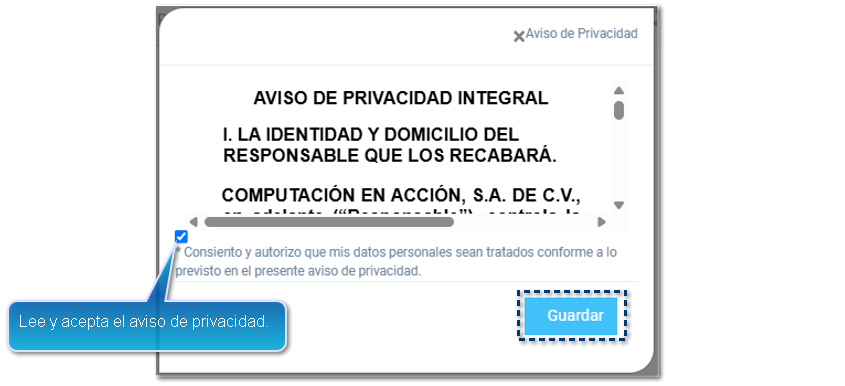En el primer ingreso se mostrarla la siguiente ventana, lee y acepta el aviso de privacidad, posteriormente haz clic en Guardar.