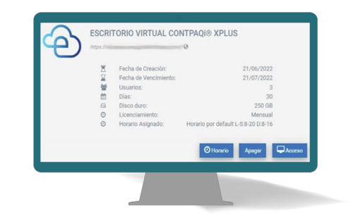 Dentro del portal CONTPAQi® encontrarás el módulo Mis Escritorios Virtuales que te ayudará a consultar las características específicas del escritorio virtual que hayas adquirido, como el Tipo de escritorio, la Fecha de Creación y Fecha de Vencimiento, el número de Usuarios que podrán ingresar de forma simultánea, y la capacidad de almacenamiento (GB) que contiene el Disco duro; además que podrás indicar un horario específico para trabajar en él, si deseas apagar o encender tu escritorio de forma manual.