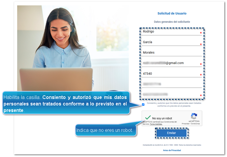 Captura la información, los datos obligatorios son Nombre, Apellidos, Correo electrónico, Código postal y RFC; habilita el tratamiento de datos personales e indica que no eres un robot, posteriormente haz clic en Enviar.