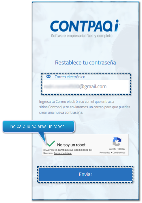 Captura el correo que acabas de registrar, indica que no eres un robot y haz clic en Enviar.