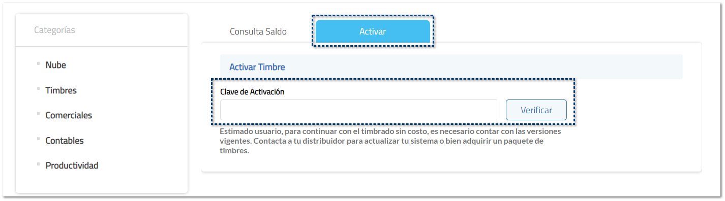 En caso de no activar el paquete de timbres desde la misma orden de compra, podrás realizar la activación desde el menú Timbres. Ingresa al menú Timbres y haz clic en la pestaña Activar. Captura la clave de activación que viene en tu certificado y haz clic en Verificar.
