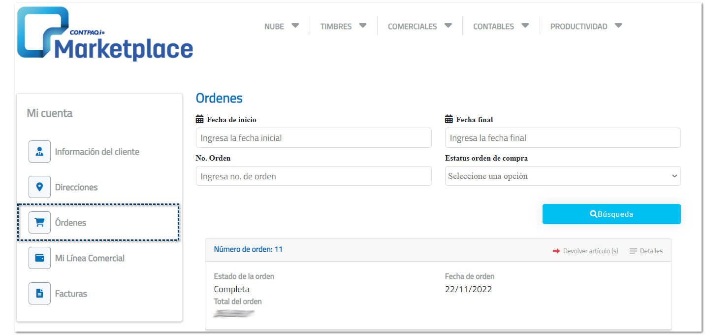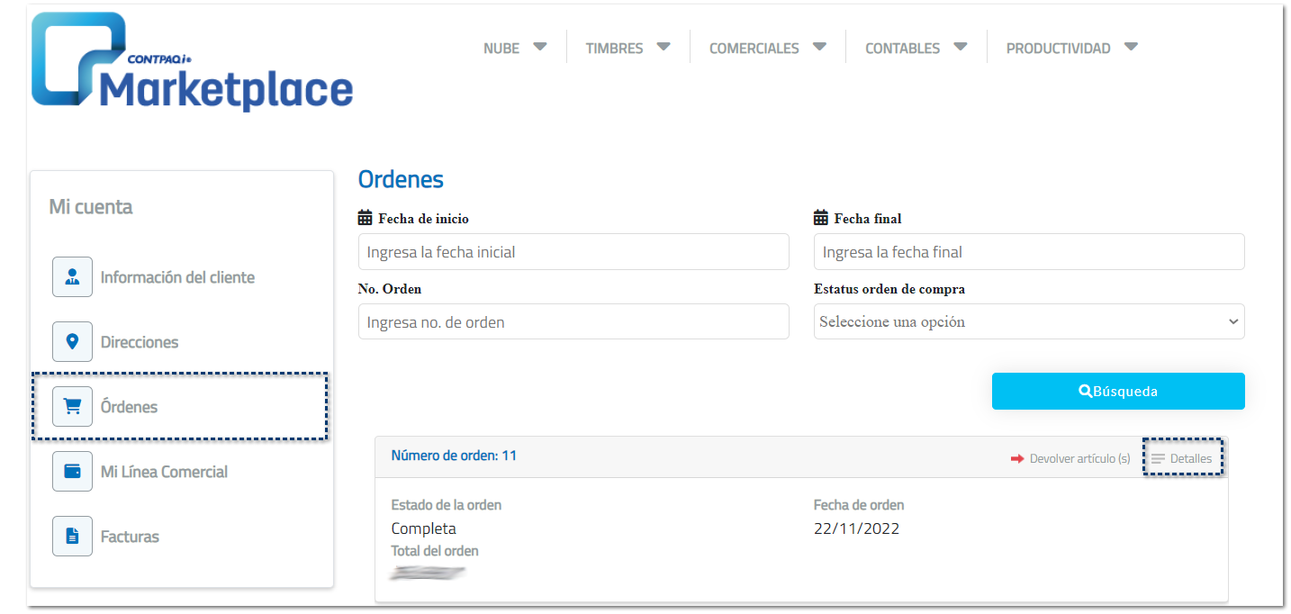 La opción Mis órdenes, te ayudará a concentrar en un listado todas las compras que realices. Podrás realizar acciones como: