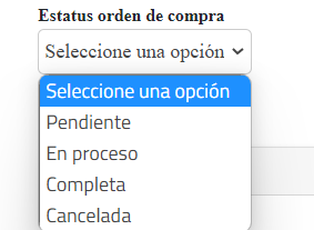La opción Estado de la orden, te permitirá conocer la situación de la orden de compra. En el listado estarán las siguientes opciones: