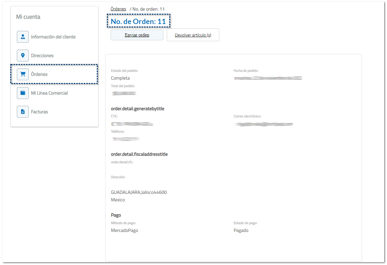 Al acceder a la opción, encontrarás el desglose de la compra. Podrás encontrar los campos como No. de orden, estado del pedido, fecha, total, los datos de la empresa, dirección, método de pago, estado de pago y la información de los productos adquiridos.
