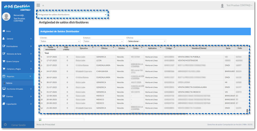 El tablero Antigüedad de saldos distribuidores permite consultar los saldos vencidos o que están por vencer de los distribuidores, para que puedas llevar un mejor control de tus operaciones.