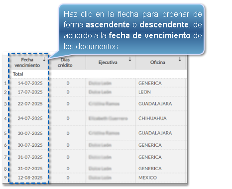 Para tener un mejor detalle de los saldos vencidos te recomendamos ordenar los registros haciendo clic en la flecha de la comuna Fecha vencimiento.