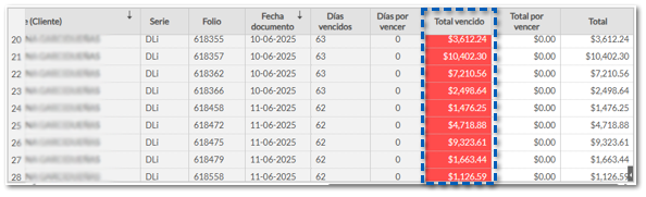 La columna Total vencido se mostrará en rojo cuando el saldo del documento haya vencido: