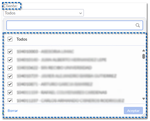 Cliente: Permite filtrar por todos los clientes o clientes en específico, así como realizar búsqueda de cualquier dato del listado; por omisión se encuentra en la opción Todos.