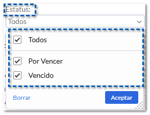 Estatus: Permite filtrar por Todos, Por Vencer o Vencido; por omisión se encuentra en la opción Todos.
