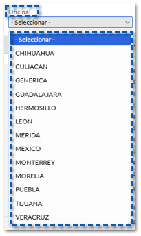 Oficina: Permite filtrar de forma general o por una oficina en específico; por omisión se encuentra en la opción Seleccionar que indica que se mostraran todas las oficinas.