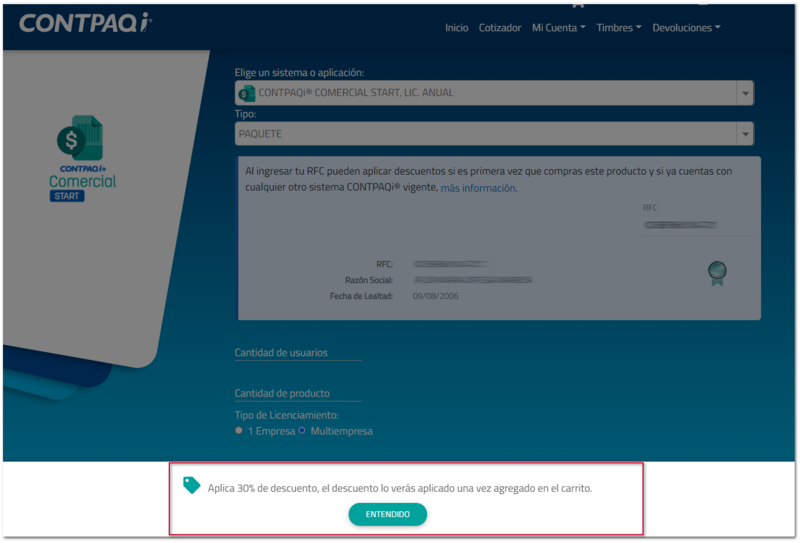 Al seleccionar el paquete y sus características, agregar RFC y cotizar, Venta en línea te mostrará el descuento correspondiente