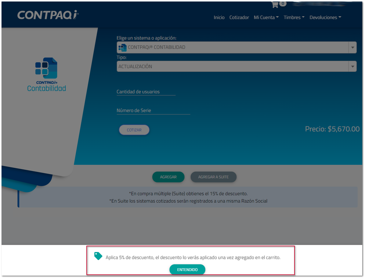 En una actualización, renovación o cambio de características el descuento se mostrará al ingresar la serie del sistema y dar clic en Cotizar.