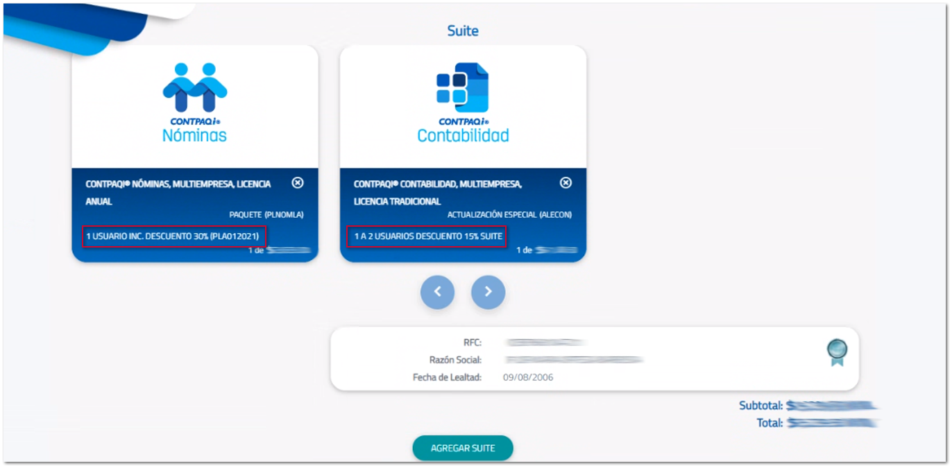 Tienes un cliente, el cual desea comprar la actualización tradicional a la última versión CONTPAQi® Contabilidad y tienes otro cliente que solicita un Paquete nuevo de CONTPAQi® Nóminas Lic. Anual que no tiene, ambos tienen 15 años de antigüedad y deseas agregar ambos productos en una misma compra, pero no en Suite ya que son para distintos clientes.