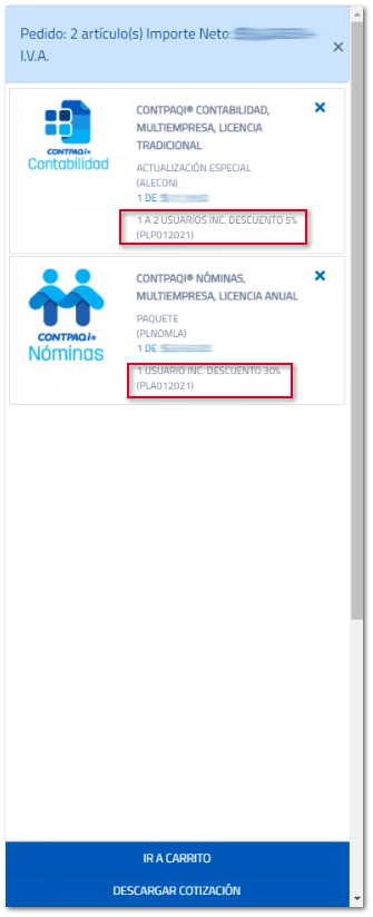 Al cotizar cada producto, Venta en línea te mostrará el descuento correspondiente y podrás visualizar también el descuento en el carrito de forma individual.