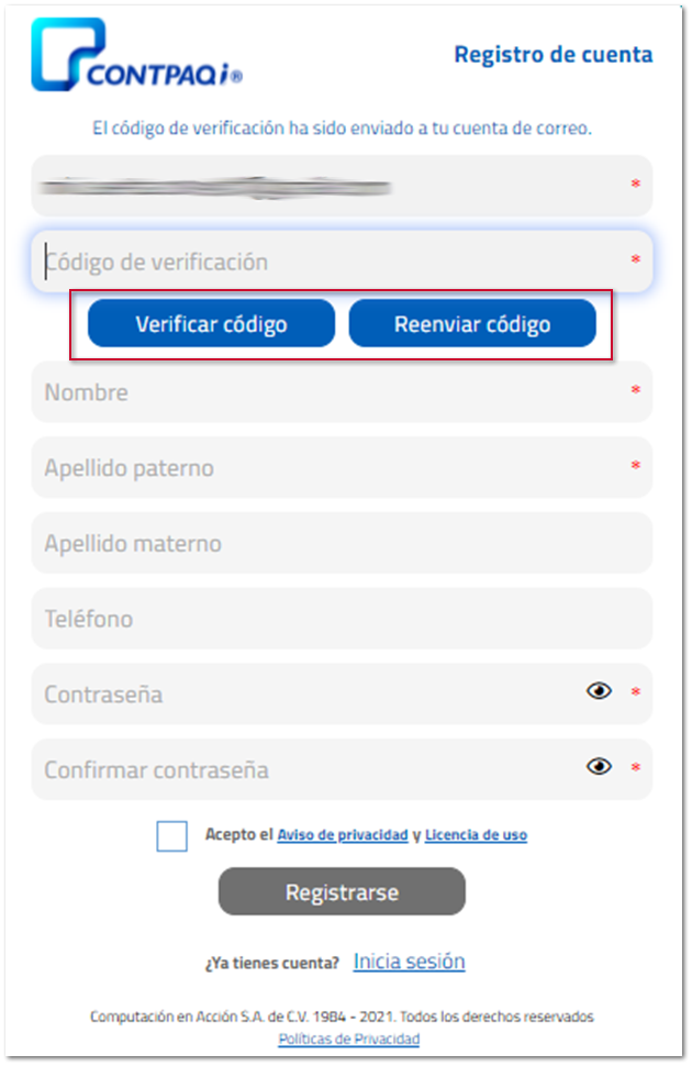 Por seguridad, se enviará un código de verificación al correo electrónico que ingresaste; cópialo y pégalo en el campo Código de verificación y da clic en Verificar código.