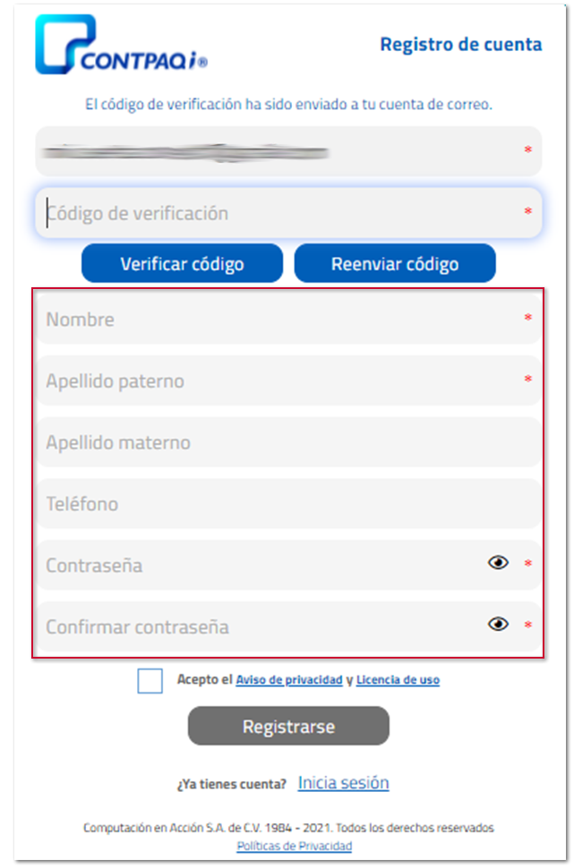 Guarda bien tus datos de acceso, ya que deberás utilizar el correo electrónico y contraseña del registro para cualquier aplicación en CONTPAQi® Nube.