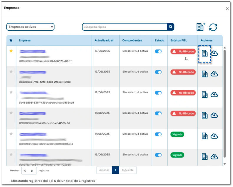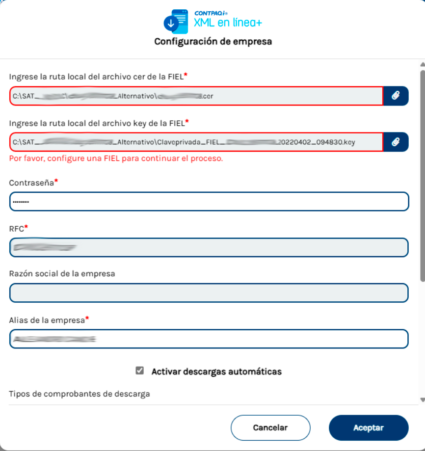 Al realizar una descarga manual, el sistema valida el estatus de la FIEL, y cuando sea Vencida o No ubicado, se mostrará el siguiente mensaje, y posteriormente se abrirá la ventana de Configuración de empresa para que se pueda realizar el ajuste necesario.