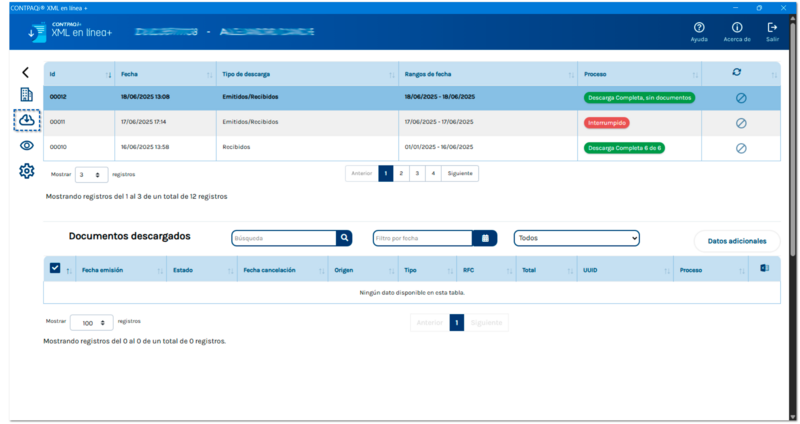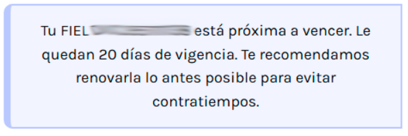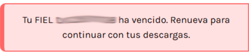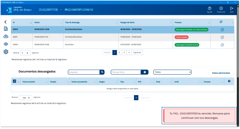Al abrir una empresa e iniciar una descarga automática en CONTPAQi XML en línea+®, el sistema notificará a través de mensajes emergentes el estatus en el que se encuentra la vigencia de la FIEL: