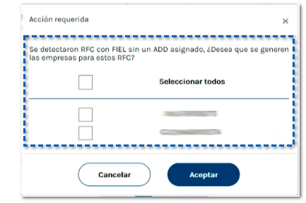 Esta ventana solo se mostrará cuando el sistema detecte que se tiene uno o varios RFC con FIEL y sin ADD.