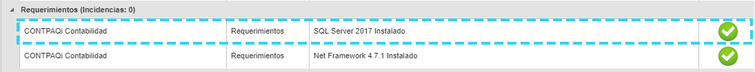 Cuando instalia® diagnostica que el equipo no tiene instalado Microsoft® SQL Server®, dentro de la sección de Requerimientos verás este icono para el componente SQL Server y se habilitará en botón Instalar SQL Server.