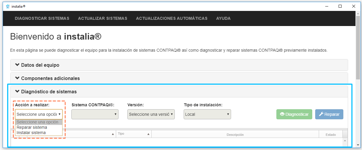 Desde esta sección se realiza el diagnóstico para la instalación y reparación de los sistemas CONTPAQi®.
