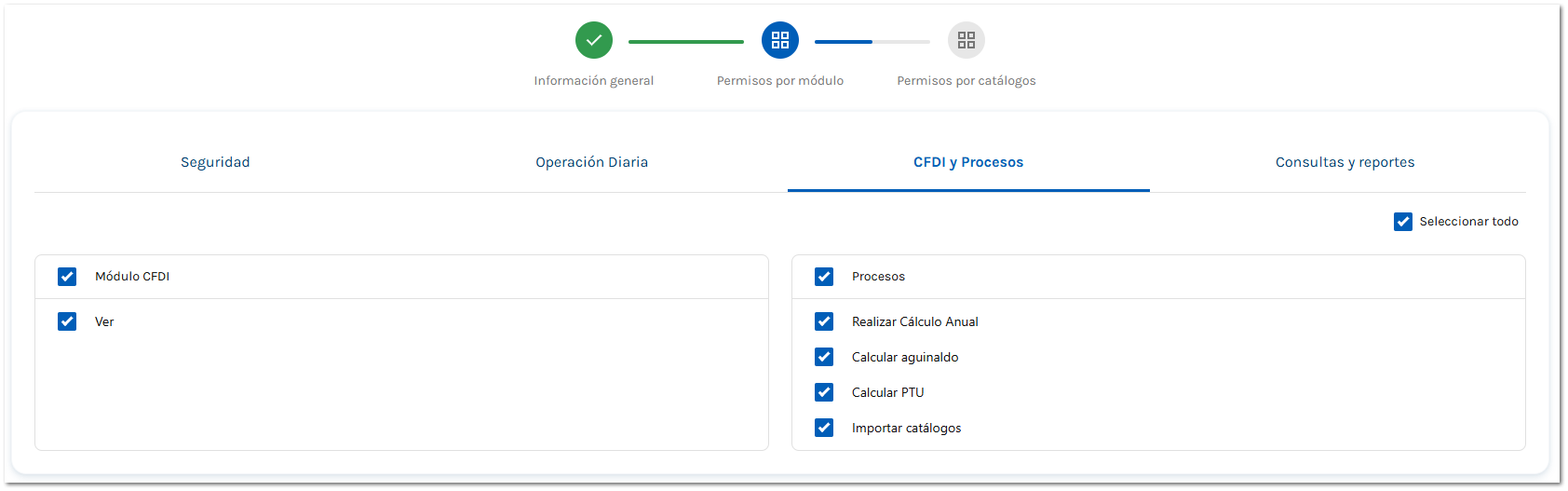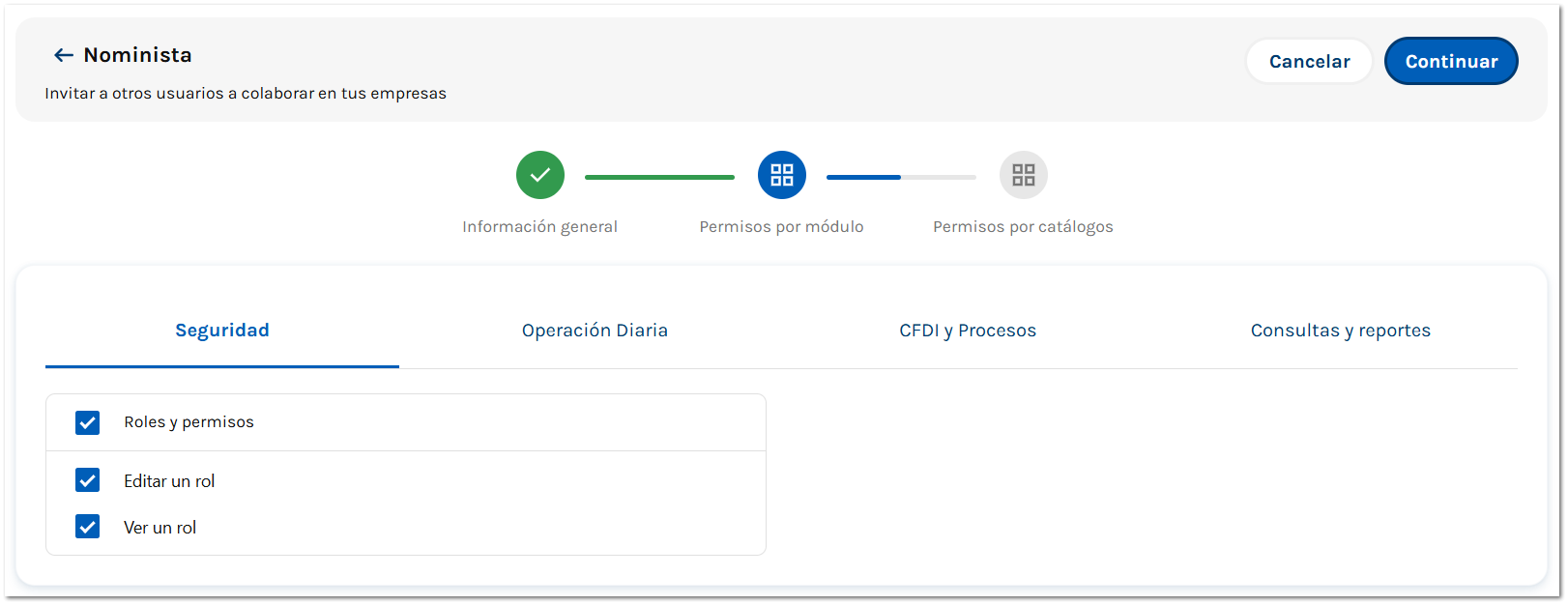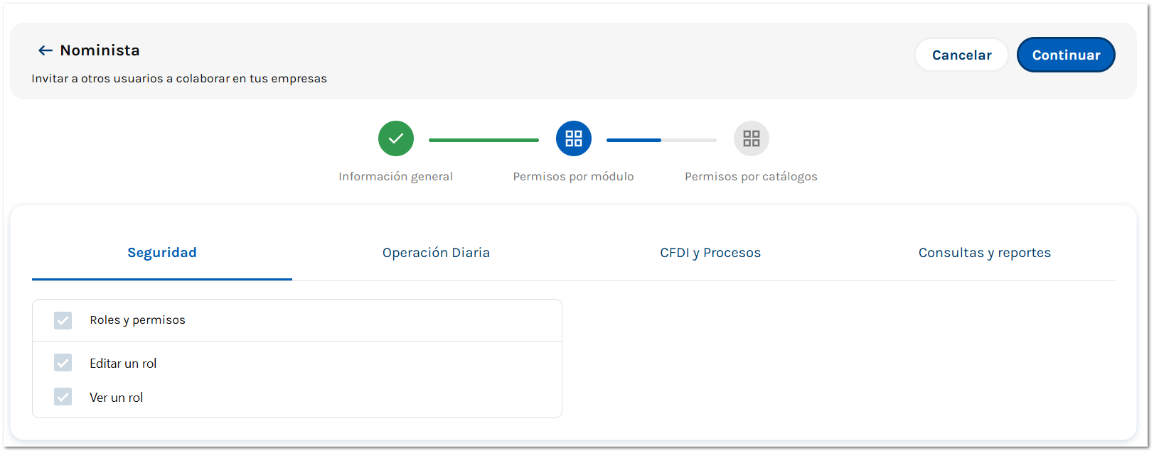 Sus permisos también pueden personalizarse de acuerdo con las tareas que desempeñe dentro de la organización, brindando acceso únicamente a los módulos necesarios para cumplir con sus funciones.