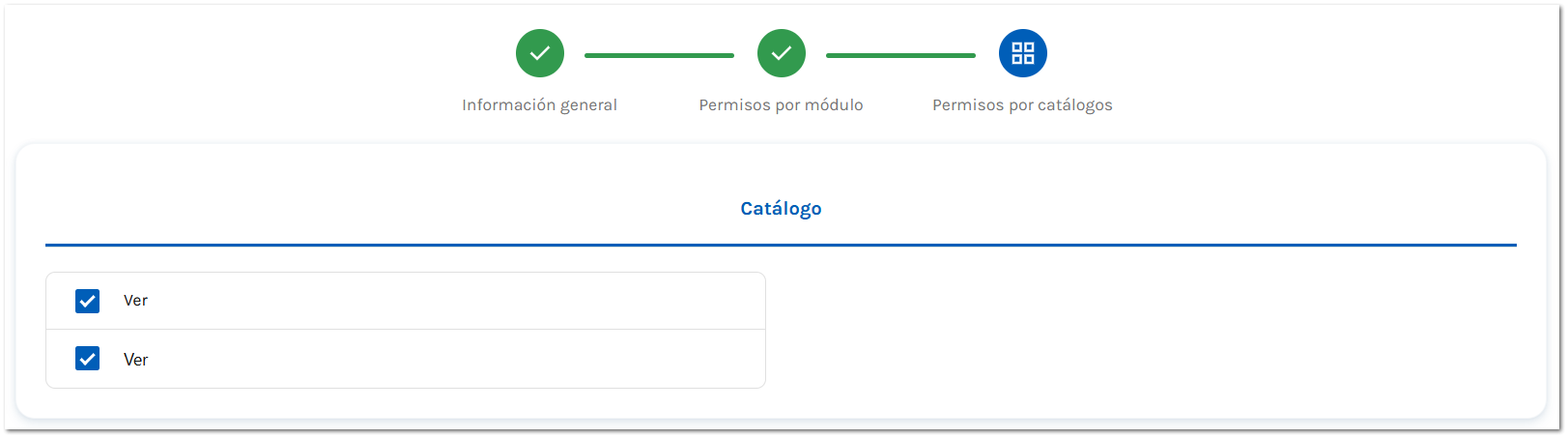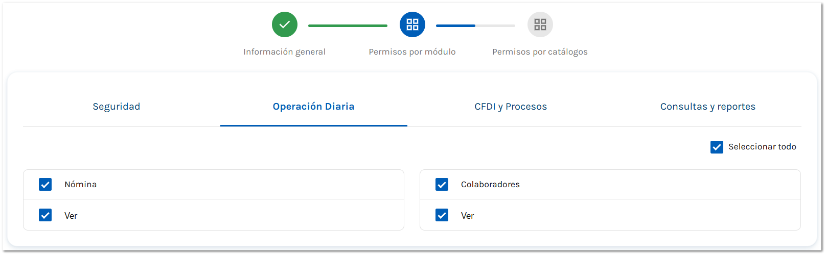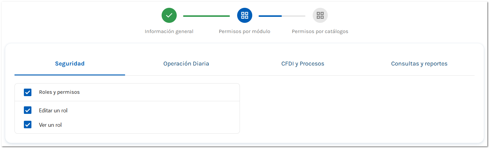 Para habilitar o deshabilitar un permiso, según cada módulo del sistema, haz clic en el check
