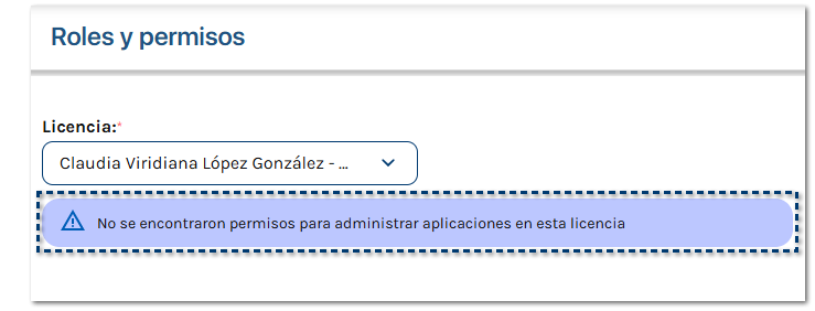 ![]() En caso de que el propietario de la licencia, deshabilite los permisos para este módulo, el usuario no podrá administrar las aplicaciones de dicha licencia, mostrando el siguiente mensaje: