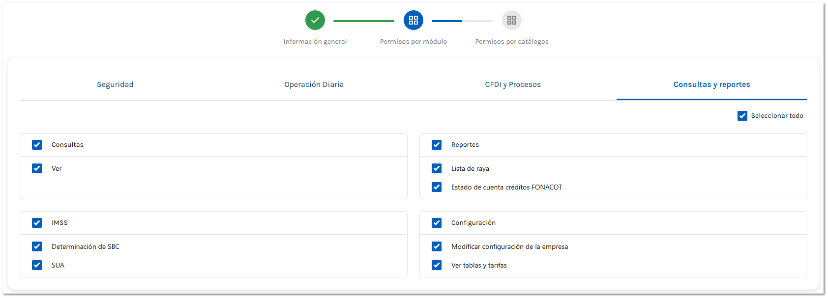 A este perfil se le pueden configurar permisos específicos según las necesidades de la empresa, permitiendo controlar su acceso a los módulos requeridos (por ejemplo: configuración de empresa, nómina, reportes o IMSS).
