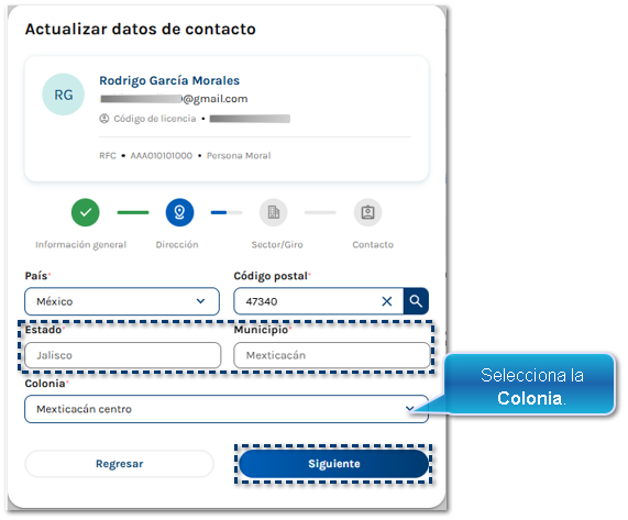 ![]() Si el RFC es correcto se muestran en automático los datos de Estado y Municipio; selecciona la Colonia y ha clic en Siguiente.
