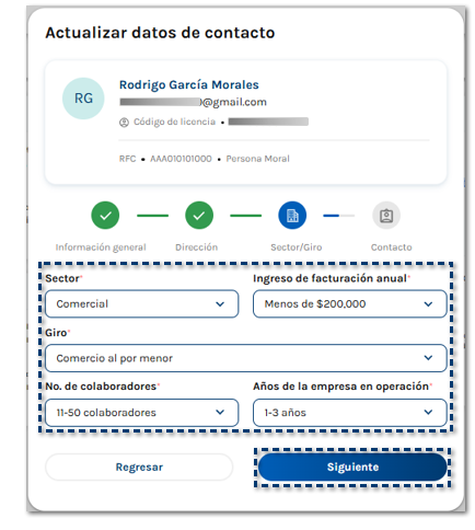Se muestra la siguiente ventana en la que debes elegir los datos del Sector/Giro, posteriormente, haz clic en Siguiente.