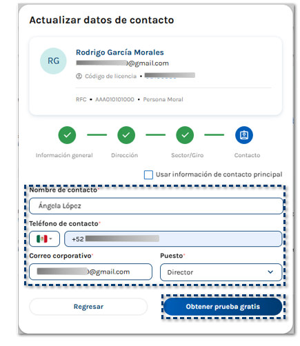 En esta sección captura los datos del Contacto: nombre, teléfono, correo corporativo y puesto, finalmente haz clic en Obtener prueba gratis.
