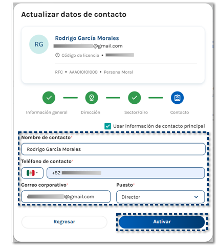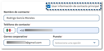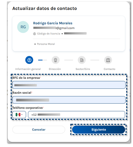 Se muestra la siguiente ventana en la que debes capturar la Información general, RFC de la empresa, Razón social y Teléfono corporativo.