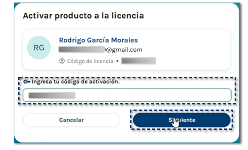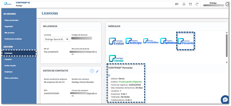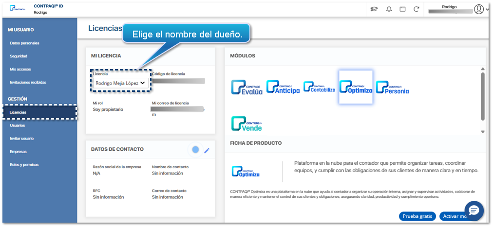 Desde la ventana principal de Mi Cuenta, haz clic en la opción Licencias, y elige el nombre del dueño de la cuenta de correo en la que deseas generar la prueba gratis.
